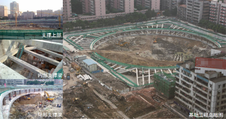 伯頓城商業(yè)中心基礎(chǔ)工程,該工程獲佛山市安全生產(chǎn)、文明施工樣板工地獎,三層地下、地下室建筑面積4萬平方米,基坑最大開挖深度16.2米,支撐圓環(huán)直徑達(dá)110米,內(nèi)支撐采用爆破拆除技術(shù)。